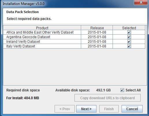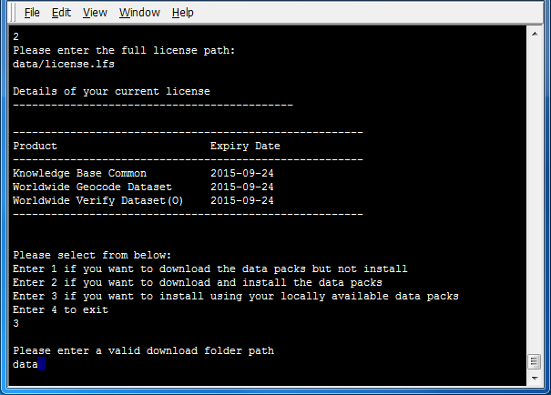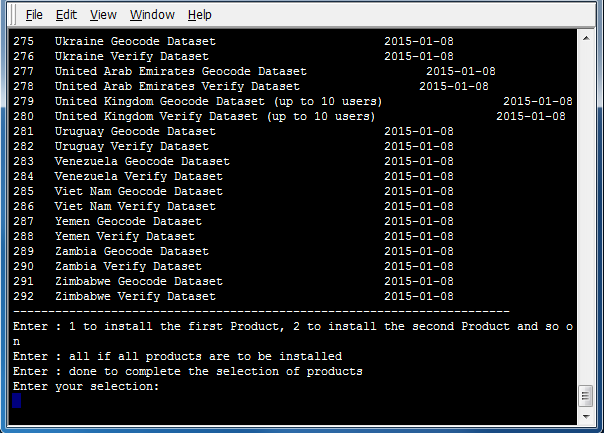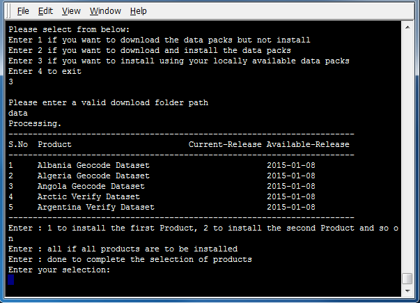 all to select all data packs. Alternatively, if only certain products are desired for installation, enter the numbers next to those products, ending the selection by entering done. Install Manager downloads data packs from download.loqate.com.