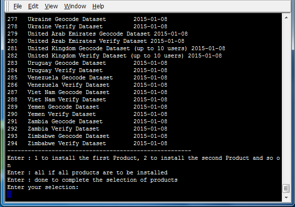 all to select all data packs. Alternatively, if only certain products are desired for installation, enter the numbers next to those products, ending the selection by entering done.