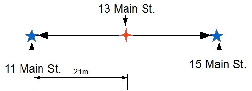What does exist is a vector or line connecting the reference data at 11 Main Street and 15 Main Street. At this point, The Loqate Engine makes the assumption that 13 Main Street is between the other two points on this line. The GeoDistance field tells us that we are no further than 21 meters from one of the reference data points. That’s still pretty close. Again, a picture may be better: