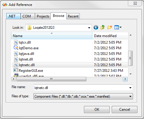 Next, let’s add the necessary DLL (digital link library) as a reference in order for your solution to run. You will need the lqtnetc.dll – the DLL through which the .NET API is referenced.