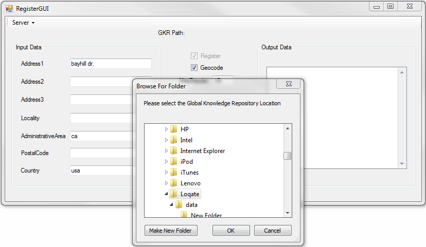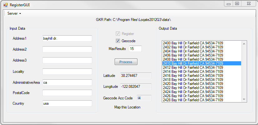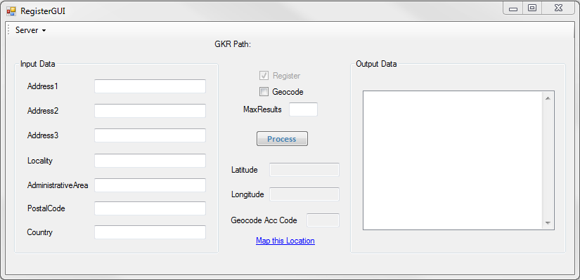 Once you launch yourWindowsApplication1.exe file, you will see the GUI come up. Go ahead and check the Geocode box, fill in the input fields with any data you would like to do a search on and enter the maximum number of results you would like returned. If you hit the Process button before specifying your GKR location, it will prompt you to select your path as shown below. Otherwise, you can go ahead and specify the GKR location first by clicking on the Server drop-down menu in the upper left-hand corner before filling out the input fields and clicking the Process button.